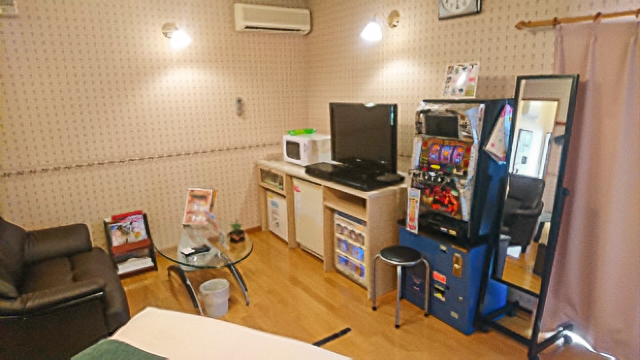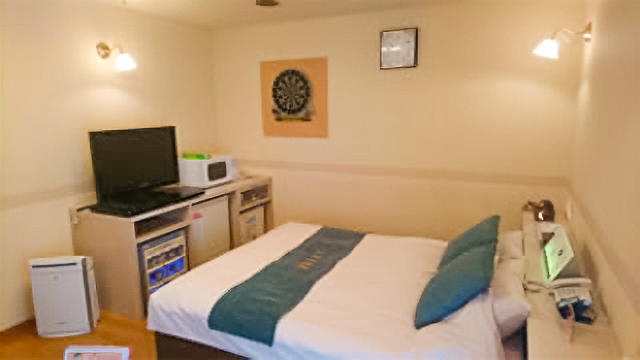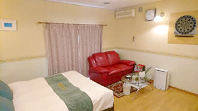 お部屋にはダーツ、大型ミラーがあり、バスタブにブラックライトがあるお部屋です。