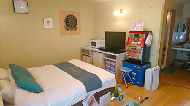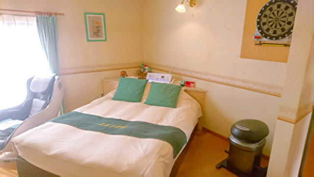 お部屋にはダーツとスロットマシンがあり、壁紙はかわいいひつじさんがいっぱいの緑のお部屋です。