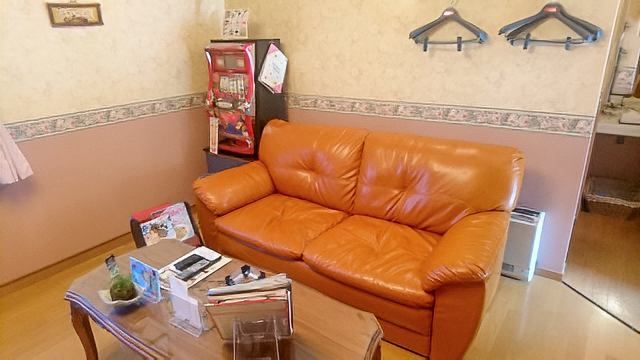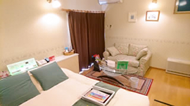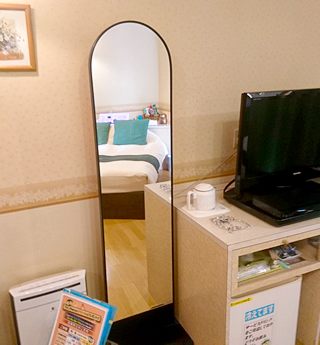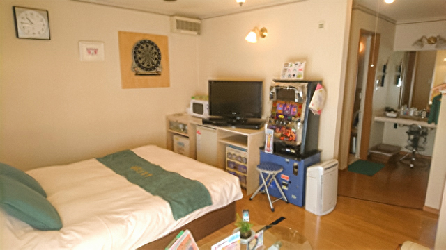 部屋全体が薄いピンクのかわいいお部屋です。お部屋にはダーツと大型のミラーがあります。