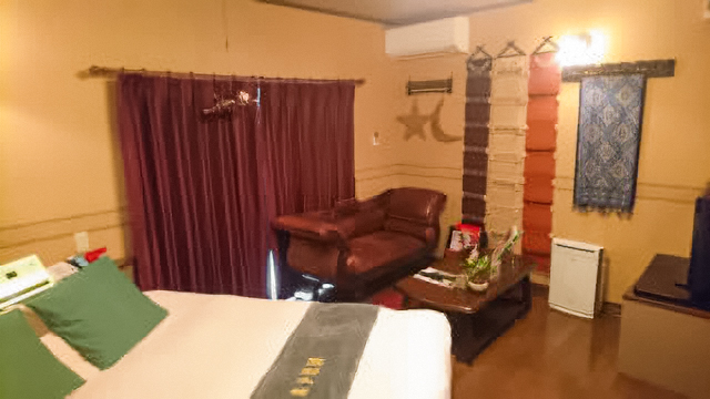 部屋全体がオレンジ色のお部屋です。イスに座って揺らすだけでまるで乗馬をしているような気分を体感できるロデオマシンとダーツがあります。